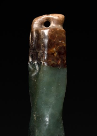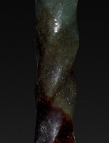 本品规格为2.8 厘米。选用玉质材料,色泽丰富,呈现出深浅不一的色调, 上半部分为较为纯净的绿色,往下逐渐过渡到深褐色乃至接近土黄色,可能是因长期受沁所致 。玉质温润,虽有沁色但仍能看出其质地细腻。整体呈细长的簪形,形态上有着独特的螺旋纹理,从顶端至尖端,螺旋纹路逐渐延伸,给人一种动态的韵律感。器物顶端有一个穿孔,方便穿绳系挂 。