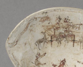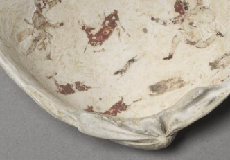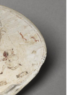 本品规格为7.5 x 9 厘米。陶盘整体造型似贝壳,器身呈浅盘状。盘内以彩绘技法描绘出丰富的图案,画面中有车马,马匹姿态灵动,车驾结构清晰;还有人物形象,或动态十足,似在进行活动,其间还点缀着动物等元素。