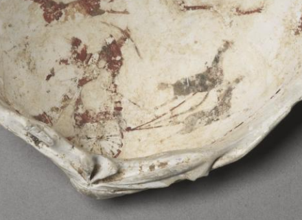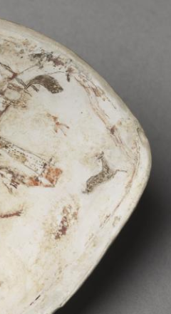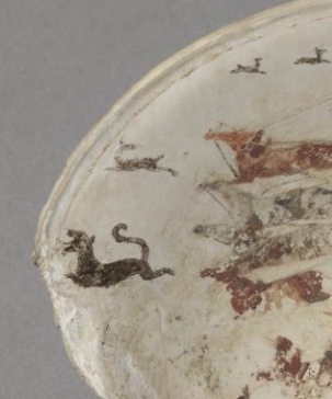 本品规格为7.5 x 9 厘米。陶盘整体呈浅盘状,造型似贝壳。盘内以彩绘技法描绘出丰富的狩猎场景,画面中有车马,马匹姿态矫健,车驾结构清晰;还有人物形象,或骑马、或徒步,动态十足,似在追逐猎物;其间点缀着各类动物,如奔跑的鹿、灵动的犬等,甚至还有飞鸟,生动展现出狩猎时的热闹与活力。