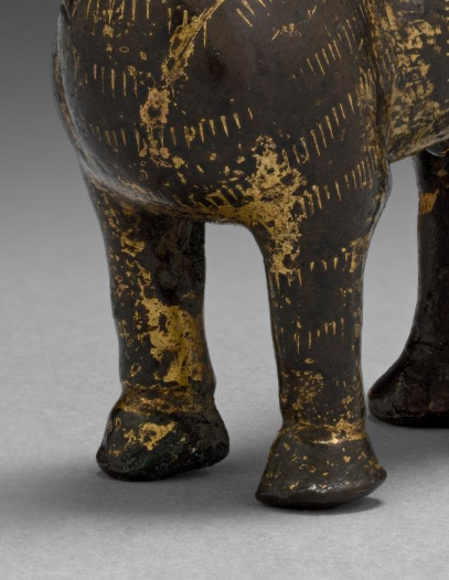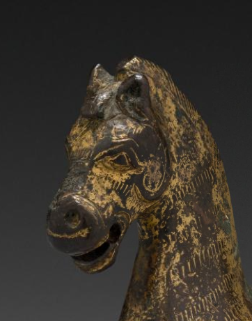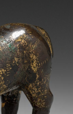 本品规格为7.8厘米。整体以青铜铸造,造型为一匹骏马,姿态挺拔。马的体表运用错金工艺,饰有精致的线条与纹路,虽历经岁月,仍能感受到错金纹饰的细腻与华美,与青铜底色相互映衬,尽显华贵。其细节刻画较为生动,马的头部、身躯等部位比例协调,展现出西汉时期高超的青铜铸造与错金工艺水平,不仅是实用或装饰器物,更承载着当时的艺术审美与工艺技术,是研究西汉青铜艺术及金属装饰工艺的重要实物。