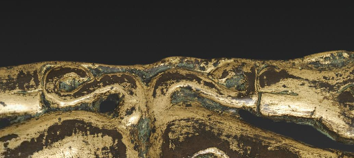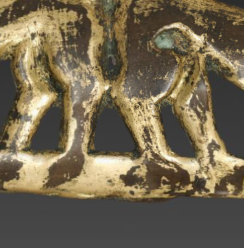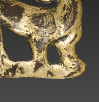 本品规格为6.1 x 11.8 厘米。饰牌呈长方形,上面塑造了两只相互呼应的兽形图案。兽的造型线条流畅,身姿矫健,姿态生动,似在互动。兽身表面有简洁的纹饰,勾勒出兽的轮廓与细节,增强了立体感与艺术表现力。整体造型富有动感与张力,展现出西汉时期动物造型艺术的独特风格。