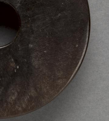本品规格为6 厘米。采用墨玉材质,整体呈现出深沉的黑褐色,色泽浓郁且均匀,质地温润细腻,表面带有自然的纹理和光泽,尽显墨玉古朴典雅的特质。为圆形扁平状,中间有一个规整的圆形穿孔,符合玉璧 “肉(璧体)倍好(穿孔)” 或相近比例的典型形制。玉璧边缘打磨得较为光滑,虽整体造型简洁,但工艺规整,体现出西汉时期玉器制作的精湛技艺。