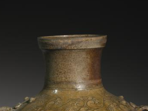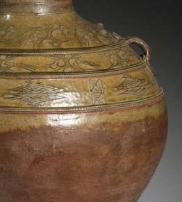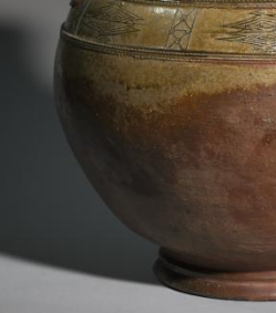 本品规格为直径39.4厘米,高度45.7厘米。整体造型饱满圆润,壶身施有青釉,釉色古朴,部分区域因岁月等因素呈现出自然的色泽变化,更显历史厚重感。壶身有精美的刻花装饰,纹饰线条流畅,构图富有韵律,展现出西汉时期陶瓷雕刻工艺的特色与水平。