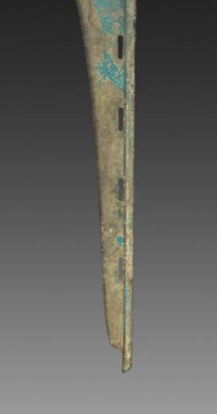 本品规格为西周青铜戈。整体以青铜铸造而成,历经岁月,表面已形成斑驳的铜绿,却更显古朴厚重的历史感。戈的造型独特,援部(戈的主要攻击部位)呈弧形,刃部锋利,便于钩、啄等攻击动作;内部(戈尾插入木柄的部分)有规整的穿孔,用于与木柄(柲)牢固连接;胡部(援下延伸的部分)带有多个阑孔,可进一步用绳等将戈与柲绑扎,增强稳定性。