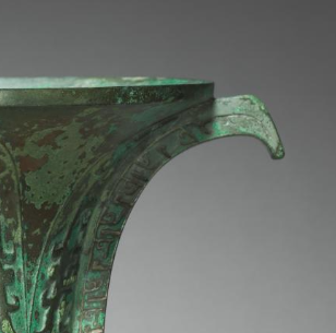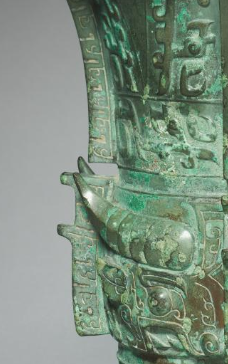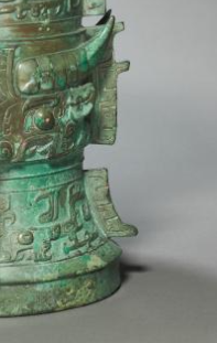 本品规格为29.5 厘米。整体造型为侈口(大口),颈部较高且略束,腹部微微鼓起,底部是圈足。器物颈部、腹部和圈足上装饰有精美的纹饰。颈部装饰有简洁的几何纹;腹部是主体纹饰区,装饰有兽面纹,兽面双目圆睁,造型威严庄重,线条刚劲有力,凸显出神秘的色彩;圈足部位也有相应的纹饰,与颈部纹饰相呼应。此外,器物上还带有扉棱,从口沿一直延伸到圈足,增加了器物的立体感和层次感。