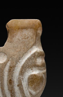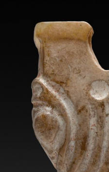 本品规格为1.9 厘米。整体造型近似兽面,呈倒 “U” 字形。兽面顶部有两个凸起部分,造型简洁;兽面中央有对称的圆形纹饰,似为兽的眼睛等器官的抽象表现;兽面两侧雕刻有流畅的卷云纹等线条,模拟兽的面部纹理与轮廓,线条虽简约却富有韵律,展现出西周时期玉器雕刻古朴大气且注重对称的风格,整体造型神秘而富有威严感。