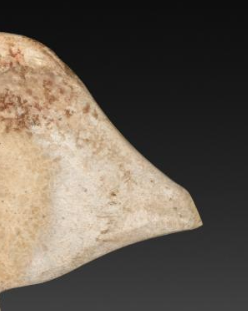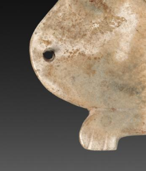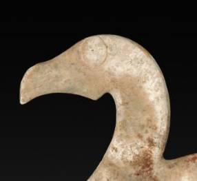 这件西周玉鹅,以玉石雕琢而成。整体造型生动,呈现出鹅的形态,鹅首前伸,喙部造型简洁,颈部弯曲自然,身躯圆润,腿部线条简洁地勾勒出姿态。玉石表面带有岁月留下的斑驳痕迹,增添了古朴之感。