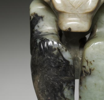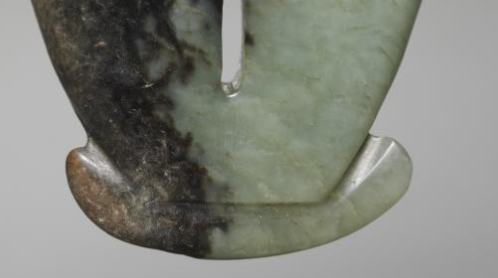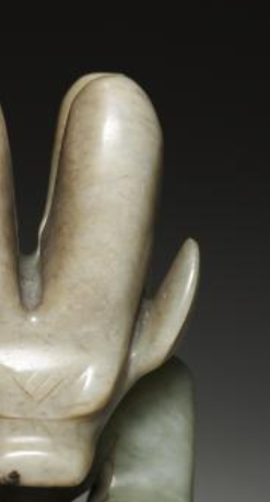 本品规格为14.6 x 6 x 4.1 厘米。整体以玉石雕琢而成,玉料呈现出淡绿与深褐等色彩交融的自然纹理,质感温润。雕件塑造出兽的形象,兽首部分造型独特,有类似双角或耳的凸起结构,面部线条简洁,通过简单的刻划展现出兽的神态。兽身部分雕刻较为古朴,线条流畅,虽造型简约,却能感受到新石器时代玉器雕刻在动物题材上的艺术风格,蕴含着当时人们对兽类的认知与审美,是研究新石器时代玉器工艺及原始艺术的重要实物资料。
