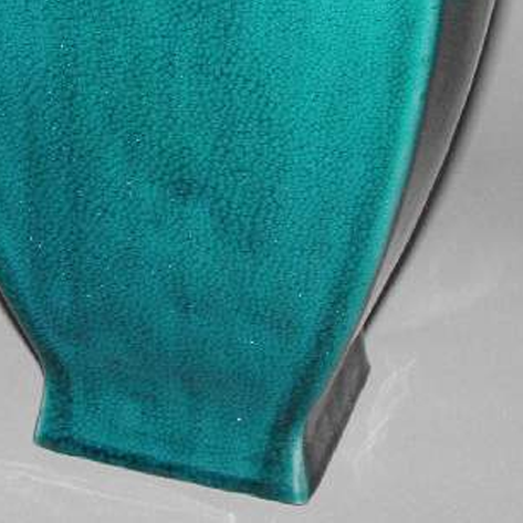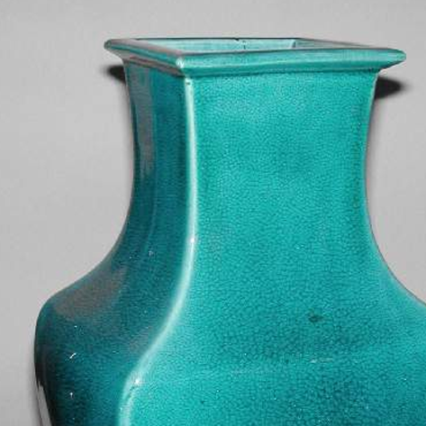 细节:方口边缘平整,颈部与肩部过渡自然;腹部四方造型,棱角分明却不尖锐;瓶身釉面布满细密的开片纹,如同冰裂,为器物增添了古朴雅致的韵味;圈足处胎质显露,呈现出淡淡的火石红色,与釉色形成鲜明对比。