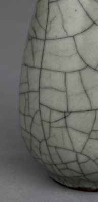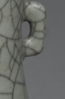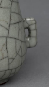 本品规格为直径6.5厘米,高度11.8厘米。整体造型独特,壶身呈修长的瓶状,口部为花口设计,线条优美别致。器身施哥釉,釉色温润,布满典型的哥窑开片,裂纹纵横交错,如冰裂般细密,形成 “金丝铁线” 的视觉效果,尽显古朴雅致之美。壶身两侧设有双系,造型精巧,既具实用的系挂功能,又增添了器物的装饰性。