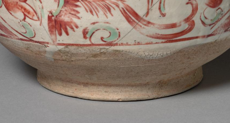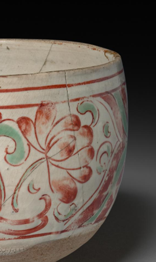 本品规格为直径16.2,高度10.2厘米。整体造型为钵形,口沿较宽,腹部饱满,底部有矮圈足。器物以白釉为地,采用红绿彩进行装饰,色彩对比鲜明。腹部绘有花鸟纹样,鸟儿形态灵动,或振翅或停驻,周围搭配盛开的花朵与卷曲的枝叶,纹饰线条流畅,富有生机与韵律。虽器物表面有明显的裂纹等岁月痕迹,但仍能从中感受到元代红绿彩陶瓷装饰工艺的特色,展现出当时工匠在色彩运用与纹饰绘制上的技艺,是研究元代陶瓷艺术的重要实物资料。