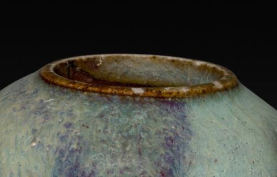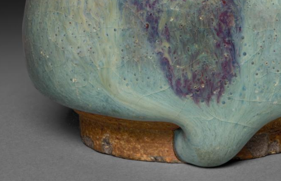 本品规格为直径5.1厘米,高度3.8厘米。整体造型独特,罐体呈近似鸡心的形状,线条圆润饱满。其施有钧窑典型的天蓝釉,釉色温润,如天空般澄澈。在天蓝釉的基底上,自然晕染出紫斑,紫斑色泽浓郁且过渡自然,与天蓝釉相互交融,形成了钧窑独特的窑变效果,宛如天空中偶然浮现的云霞,变幻莫测,极具艺术感染力。