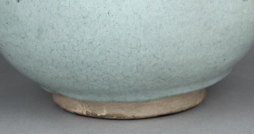 本品规格为直径12.1厘米,高度16.4厘米。罐身施有钧窑典型的天蓝釉,釉色如天空般澄澈淡雅,釉面布满自然且富有层次感的开片纹理,为器物增添了古朴雅致的韵味。罐身两侧点缀着绚丽的紫斑,色彩对比鲜明,灵动自然,是钧窑 “窑变” 工艺的精彩体现。罐体两侧设有两个系耳,便于系绳搬运,兼具实用性与装饰性。底部为圈足,圈足部分质感质朴,与上部莹润的天蓝釉形成对比,更显器物的历史厚重感。