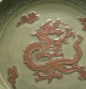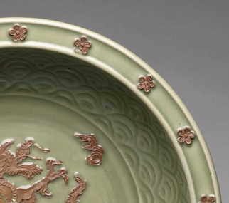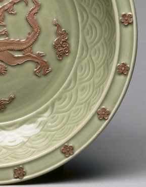 元代龙泉窑青釉露胎贴花云龙纹大盘
