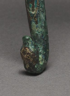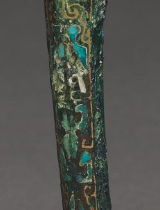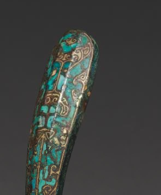 本品规格为13.3 厘米。带钩整体造型修长,呈弯曲状,线条流畅自然。钩首可能为兽首造型,细节雕刻较为精致,展现出一定的立体感;钩身表面运用错金银工艺装饰有精美的纹饰,可能是云纹、蟠螭纹等具有战国时期典型风格的图案,纹饰线条细腻流畅,富有动感;镶嵌的绿松石分布于纹饰之间,与金银纹饰相得益彰,进一步增强了器物的美观度。