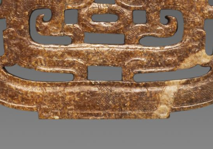 本品规格为4.8 x 7.5 厘米。以玉石为材质,整体造型精致复杂。采用透雕工艺,雕刻出龙凤等纹饰,龙纹矫健灵动,凤纹优雅飘逸,线条流畅自然,将龙与凤的形态刻画得栩栩如生。玉饰表面纹理细腻,色泽古朴,带有岁月沉淀的质感,部分区域可见自然的沁色,更显沧桑厚重。