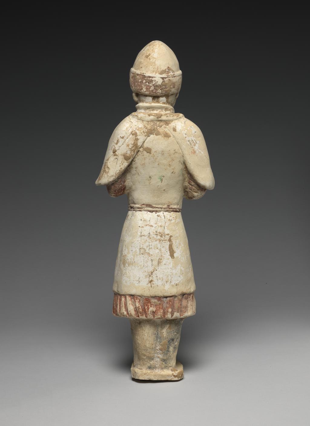 整体造型:陶俑为站立姿态,头戴尖顶头盔,身着长袍,外披披风,双手交叠于胸前,似持有物品(现已缺失),整体造型庄重威严,展现出武士的肃穆气质。