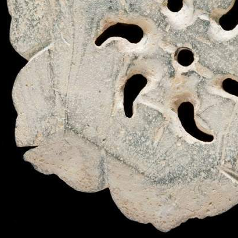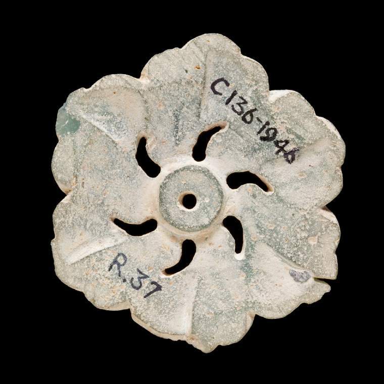 细节:花瓣的边缘较为圆润,中间的镂空花纹线条流畅,呈现出对称的美感;饰件上有编号 “C136 - 1946” 和 “R.37”,是收藏过程中留下的标识;表面有一些细小的划痕和磨损痕迹,是长期流传和使用的见证。
