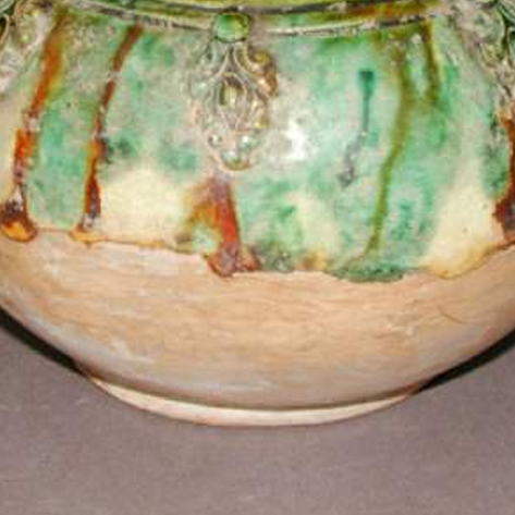 细节:罐身腹部贴有兽面等形状的装饰贴片,贴片造型立体,增加了器物的装饰性;口沿处有一圈较窄的深色釉带,与腹部的多彩釉面形成对比;罐身上还能看到因烧制过程中釉料流动形成的不规则纹理,展现了三彩釉自然晕染的独特魅力。