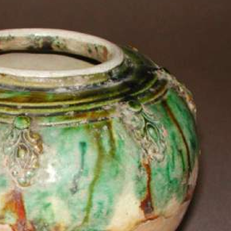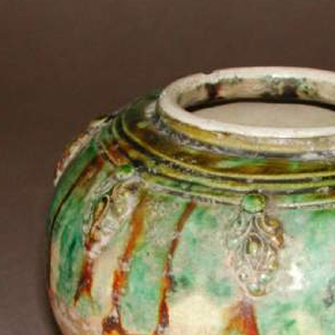 唐代是中国陶瓷史上三彩工艺发展的鼎盛时期。三彩器以其多彩的釉色和丰富的造型而闻名,它的出现是唐代社会经济繁荣、文化开放的体现。唐代的三彩器制作工艺成熟,工匠们通过在白陶胎上施多种金属氧化物为呈色剂的釉料,经高温烧制,使釉色相互浸润融合,产生绚丽多彩的效果。三彩器不仅是实用的生活器皿,更多作为陪葬品用于墓葬,题材广泛,包括人物、动物、生活用具等,反映了唐代的社会生活、审美观念和丧葬文化。然而,近代以来,西方列强对中国进行侵略和掠夺,大量珍贵文物流失海外,这件唐代三彩贴花罐就是近代中国文物流失的见证,反映了当时中国文物保护面临的严峻形势。