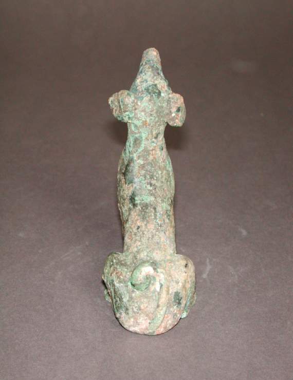 细节:犬的头部刻画细致,耳朵、眼睛、鼻子等五官清晰可辨,眼睛虽因锈蚀有些模糊,但仍能看出其传神的神态;犬的身体线条流畅,肌肉轮廓隐约可见,表现出犬的健壮体态;尾巴的卷曲造型自然,与整体姿态相协调;四肢的关节和脚部细节也有所体现,虽较为简略,但能看出工匠对犬类形态的观察和塑造能力。