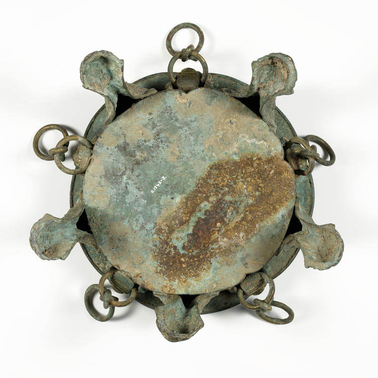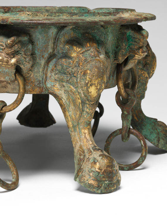 细节:兽足造型生动,雕刻细致,兽首形象威严,足部肌肉线条感强;盘口花边规整,边缘有细微的起伏变化;承盘上还带有环形构件,可能用于悬挂或固定,构件与兽足等部分的衔接自然,工艺精湛;表面有一些细小的划痕和磨损痕迹,是长期流传和使用的见证。