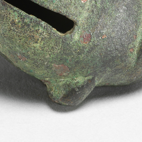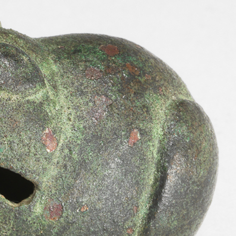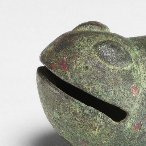唐代是中国古代文化艺术蓬勃发展的时期,青铜制品除了传统的礼器、兵器外,也有不少用于日常生活或娱乐的小件器物。蛙在中国传统文化中是吉祥的象征,代表着多子多福、生命力旺盛等美好寓意,常被运用到各类工艺品的造型中。唐代工匠们凭借精湛的技艺,将实用功能与艺术审美相结合,创造出许多造型生动、寓意美好的青铜小物件。这些小物件不仅反映了唐代的工艺水平和民间的审美情趣,也展现了当时社会生活丰富多彩的一面。然而,近代以来,西方列强对中国进行侵略和掠夺,大量珍贵文物流失海外,这件唐代青铜蛙形响器就是近代中国文物流失的见证,反映了当时文物保护面临的严峻形势。