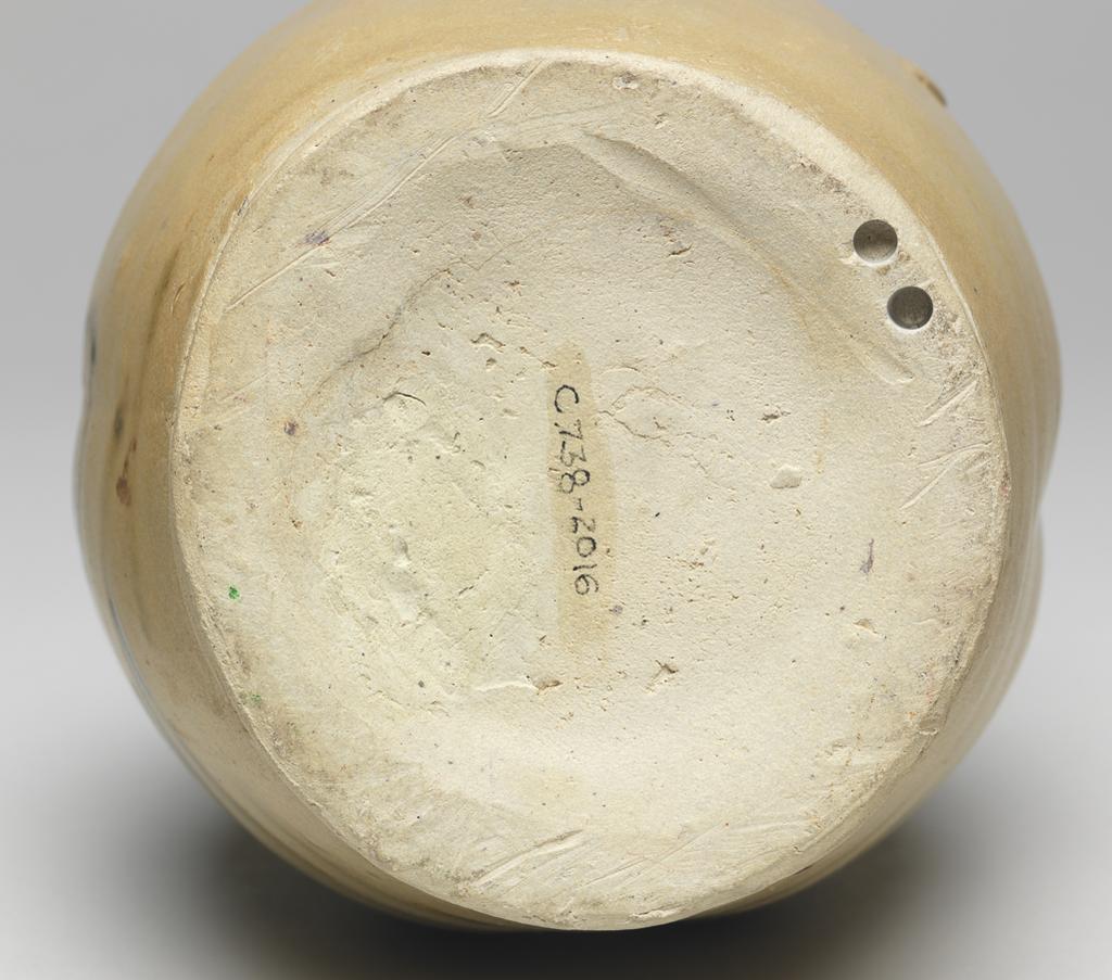 细节:流口小巧,便于液体倾倒;曲柄造型优美,便于握持;腹部的褐绿彩花卉纹绘制较为写意,花瓣、叶片的形态生动自然,虽历经岁月,仍能感受到唐代工匠的艺术表现力;底部可见 “C.738 - 2016” 的馆藏编号,是博物馆收藏后所做的标识。