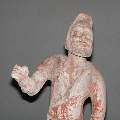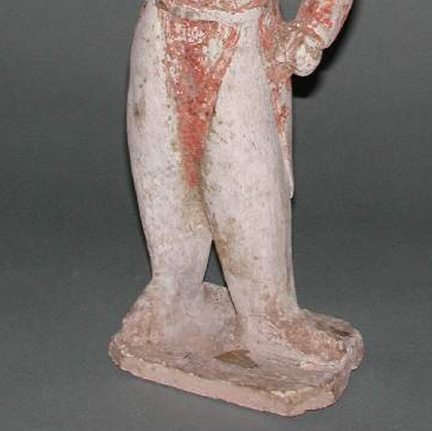 材质与色泽:以陶土为胎,质地较疏松;表面原有彩绘,现多已剥落,残留红褐色彩绘痕迹,陶胎呈浅土黄色,局部因氧化和埋藏环境呈现斑驳质感。