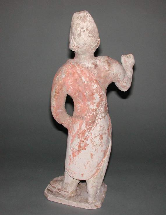 细节:胡帽造型独特,面部刻画写实,胡须清晰;长袍线条流畅,腰间系带凸显身形;手臂姿态自然,手部握拳,似握有物品(已缺失);底座边缘略显粗糙,留有制作时的痕迹。