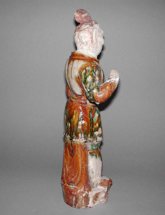 细节:面部刻画细致,眉眼、胡须线条清晰,尽显武士威严;铠甲处有凸起装饰,模拟金属质感;衣袍褶皱通过釉色流淌与陶塑线条表现,虽有磨损仍可见工艺细腻;冠饰顶部凸起,增加了立体感。