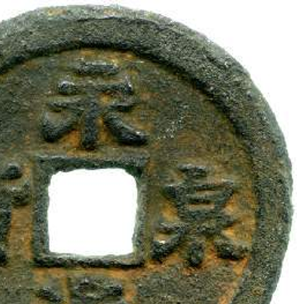 细节:钱币正面铸有 “永通泉货” 四字,字体为隶书,笔画较为粗壮,虽因铁钱质地和锈蚀有些模糊,但仍能看出文字的基本结构与书法韵味;背面较为简洁,无过多纹饰,仅能看到因铸造和锈蚀形成的粗糙质感。