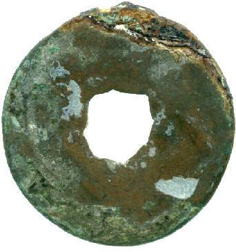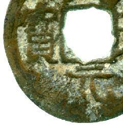 细节:正面铸有 “开元通宝” 四字,字体为隶书,笔画清晰但因锈蚀有些模糊,文字布局协调;背面较为简洁,中间为方孔,边缘有铸造时留下的痕迹,方孔周围也有使用过程中形成的磨损痕迹。