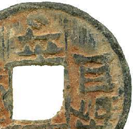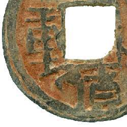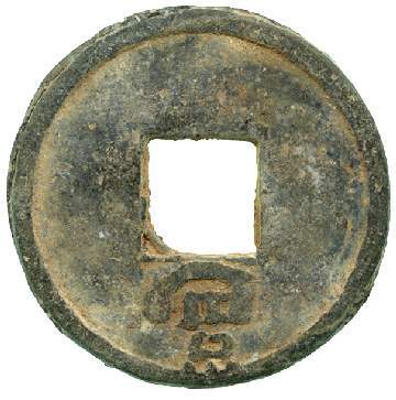 细节:正面铸有 “元祐通宝” 四字,字体为篆书(或行书等其他书体,从图中看偏向篆书),笔画婉转流畅,布局匀称,但因锈蚀和磨损,部分文字边缘略显模糊;背面较为简洁,中间为方孔,下方有一些模糊的符号或印记,可能是铸造过程中的标识或后期磨损形成的痕迹。