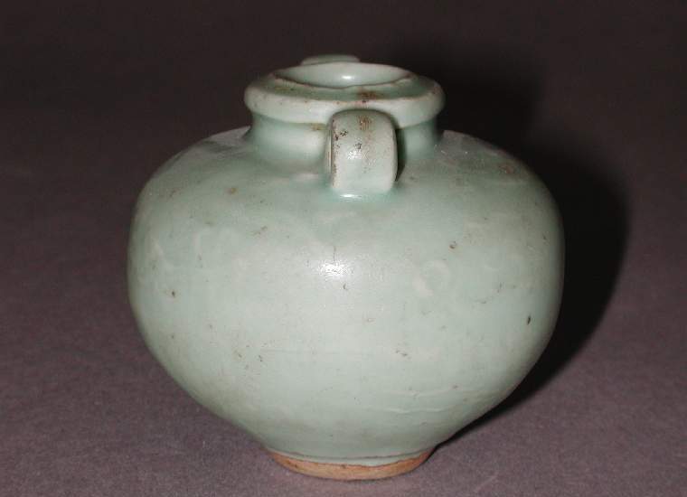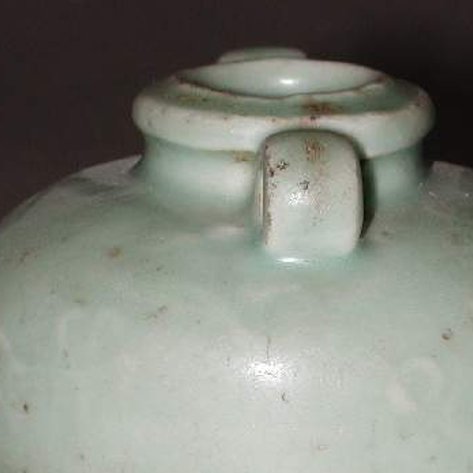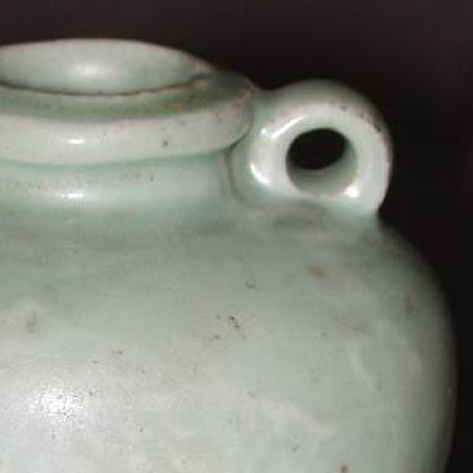 细节:颈部与肩部的过渡自然,环形系制作规整,与罐身衔接牢固,系的内壁光滑。腹部釉面有隐约的纹饰痕迹,虽不清晰,但能感受到元代龙泉窑瓷器在装饰上的简约风格。底部露胎处呈红褐色,是龙泉窑瓷器 “朱砂底” 的典型特征,尽显岁月沧桑。