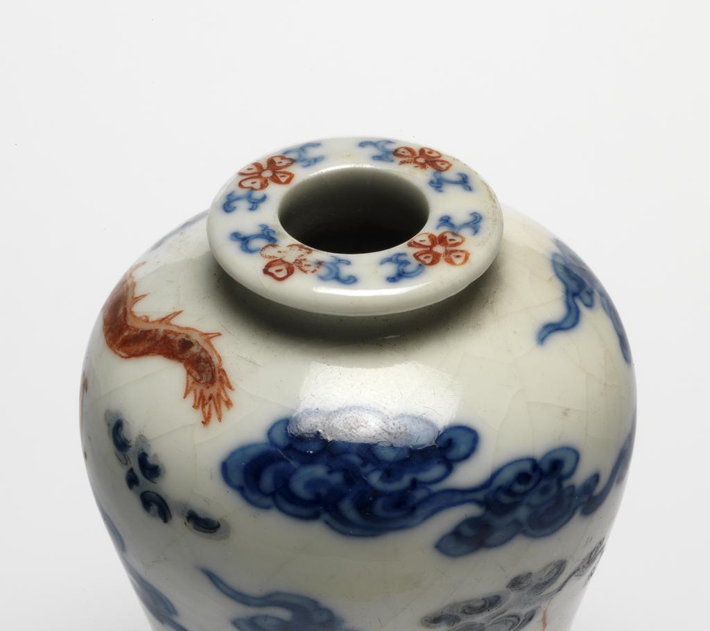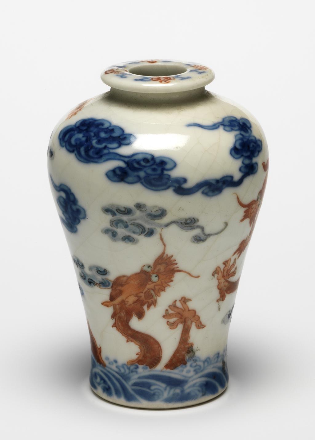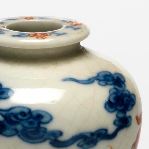 细节:瓶口边缘绘有青花和矾红彩组成的花卉纹,细腻精致,增添了瓶口的美感;瓶身主体以云龙纹为装饰,龙纹刻画极为细腻生动,龙身矫健,张牙舞爪,龙须飘动,双目炯炯有神,尽显威严霸气。云纹形态各异,或如绵团,或似飘带,与龙纹相互呼应,营造出龙腾云海的壮观场景。底部的海水纹以青花绘制,线条流畅,富有动感,仿佛波涛汹涌。此外,釉面可见自然形成的细小开片,增加了器物的古朴韵味。