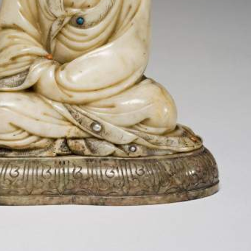 材质与色泽:主体部分采用玉料雕琢而成,玉质温润细腻,色泽呈现出柔和的米白色,带有自然的纹理,岁月的沉淀使其更具古朴韵味。身上镶嵌的宝石色彩鲜艳,有红、蓝等颜色,增添了华丽之感;底座疑似金属材质,表面有雕刻的花纹,呈现出古朴的色泽。