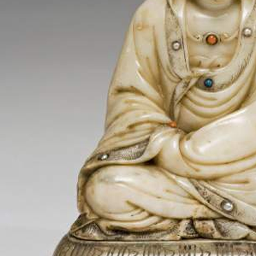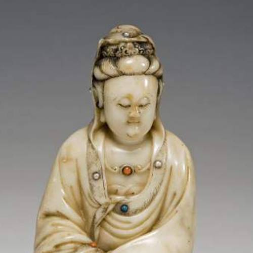 清代是中国玉器发展的又一个高峰时期,玉器制作工艺在前代基础上进一步发展,达到了很高的水平。宫廷对玉器极为重视,设有专门的造办处,集中了大量能工巧匠,制作出许多精美的玉器,同时民间的玉器制作行业也十分繁荣。观音作为佛教中慈悲和智慧的象征,在清代深受人们信仰和喜爱,以观音为题材的各类艺术品层出不穷。玉器雕刻的观音像不仅是宗教供奉的圣物,也是精美的艺术品,反映了当时的宗教信仰、审美观念和高超的工艺水平。而近代以来,西方列强对中国进行侵略和掠夺,加上国内的动荡,导致大量珍贵的清代玉器流散海外,这件清代玉嵌宝观音坐像就是近代中国文物流失的见证。