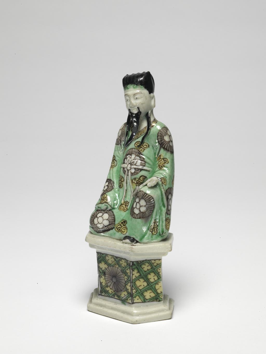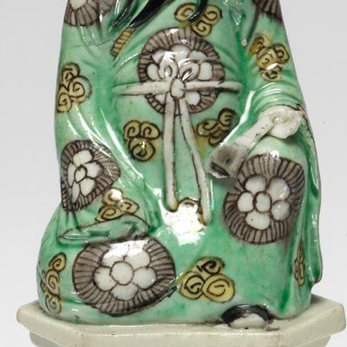 清代是中国瓷器发展的鼎盛时期,素三彩是清代瓷器的重要品种之一,在继承前代工艺的基础上有所发展。素三彩以黄、绿、紫三色为主(也有其他色彩搭配),不用红色,风格素雅。清代的瓷器生产不仅满足国内需求,还大量出口到海外,成为中外文化交流的重要载体。这件素三彩人物坐像反映了清代瓷器的工艺水平和艺术风格,也从侧面体现了当时中外文化贸易的情况。然而,近代以来,西方列强的侵略和掠夺,加上国内的动荡,导致大量清代珍贵瓷物流失海外,这件素三彩人物坐像就是中国近代文物流失的一个缩影。