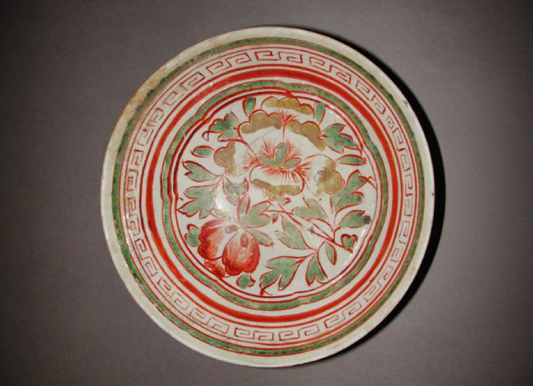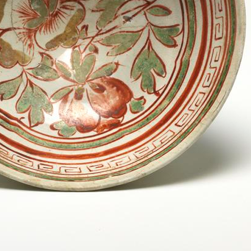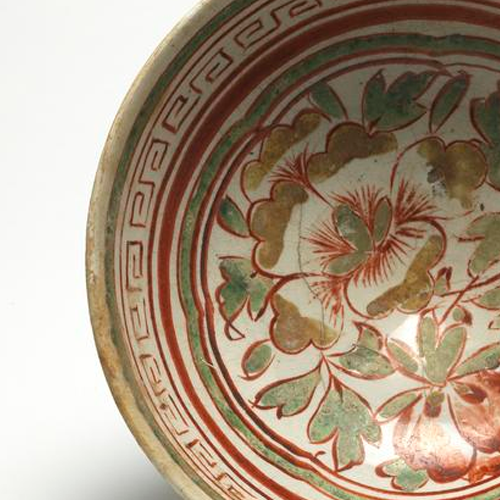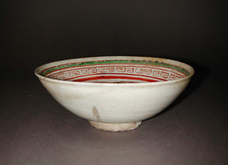 细节:碗内壁中心绘有花卉图案,花朵饱满,花瓣层次分明,绿叶衬托,栩栩如生;花卉周围环绕着几何回纹等辅助纹饰,线条流畅,工艺精细。碗口沿处有多道红绿相间的弦纹,起到了装饰边缘的作用,使得整体更加美观。碗的圈足部分略显粗糙,有一些因烧制和使用留下的痕迹,展现出岁月的沧桑感。