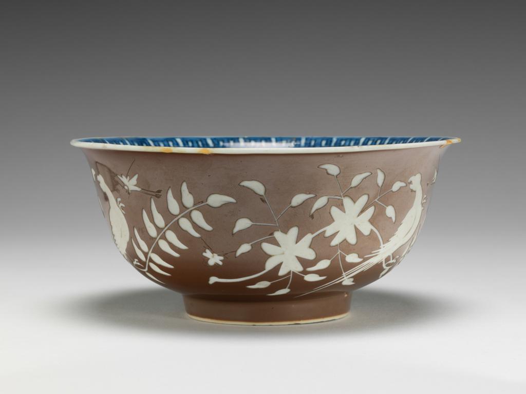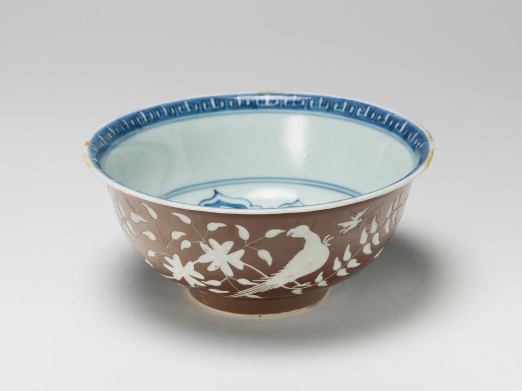 清代是中国瓷器发展的鼎盛时期,景德镇作为制瓷中心,瓷器的制作工艺、装饰技法都达到了很高的水平。在装饰方面,除了传统的青花、粉彩等,像酱釉、留白等技法也广泛应用。花鸟纹是清代瓷器中常见的装饰题材,寓意吉祥美好。这类瓷器不仅是日常生活用品,也反映了当时人们的审美情趣和对美好生活的向往。同时,清代的瓷器大量出口到欧洲等地区,受到西方人的喜爱和追捧。这件酱釉留白花鸟纹青花碗可能是当时生产的外销瓷,反映了清代瓷器制作工艺的高超以及中外文化交流的繁荣。然而,近代以来,西方列强的侵略和掠夺,加上国内的动荡,导致大量中国瓷器流散海外,成为中国文物流失历史的一部分。