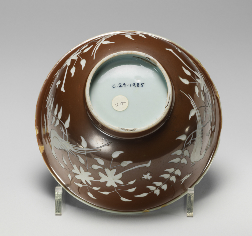 晚清至民国时期,国内局势混乱,经济衰败,许多家庭或藏家因生活所迫,将家中所藏文物出售。这件清代酱釉留白花鸟纹青花碗可能从民间流出,进入文物交易市场,被外国文物贩子或其代理人发现并低价收购,之后通过海上走私等非法文物贸易途径运往英国,最终被剑桥大学费茨威廉博物馆收藏。