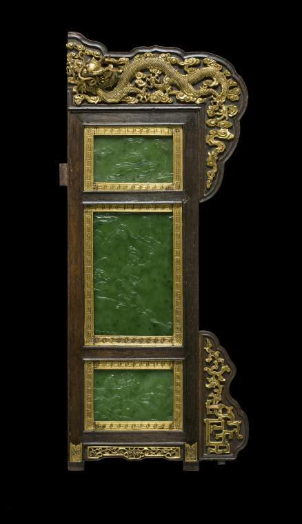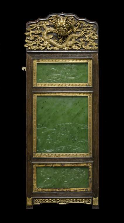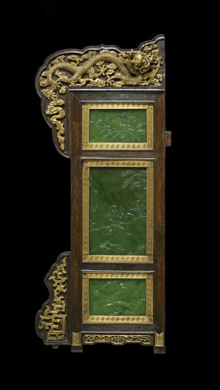 :清代是中国传统工艺发展的鼎盛时期之一,尤其是在宫廷器物制作方面,集历代工艺之大成,精益求精。屏风作为一种重要的室内陈设器物,不仅具有实用功能,用以分隔空间、挡风等,更是身份和地位的象征。碧玉、金漆、木雕等多种工艺的结合,体现了清代高超的工艺水平和奢华的审美风尚。当时,宫廷及贵族对这类精美的工艺品需求旺盛,促进了相关工艺的发展和传承。然而,近代以来,西方列强的侵略和掠夺,加上国内的动荡不安,导致大量珍贵的清代文物流失海外,这件碧玉嵌金漆木雕龙纹屏风就是中国近代文物流失历史的见证。