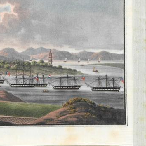 材质与色泽:以纸张为载体,画面采用颜料绘制。纸张因年代久远,边缘泛黄,略有污渍和磨损痕迹。画面色彩丰富,天空呈现出灰蓝色调,表现出阴沉的天气氛围;海水为灰黑色,船只的颜色主要为黑色和棕色,陆地上的植被为绿色,远处的山峦颜色较淡,整体色调搭配营造出一种凝重的氛围。