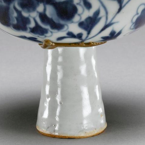 整体造型:碗为敞口,弧腹,下接高足,造型挺拔秀丽,高足的设计不仅增加了器物的美观度,也方便持握,符合元代高足碗的典型样式。