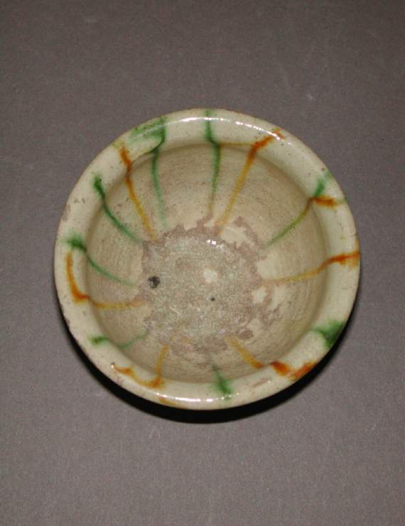 细节:盏内外壁的釉色分布自然,色彩的流淌形成不规则的条纹状,每一件的釉色分布都独一无二。口沿部分较为平整,圈足底部有一些因烧制留下的痕迹,显示出唐代陶器制作的工艺特征。