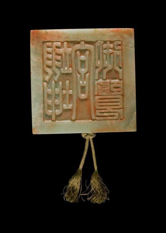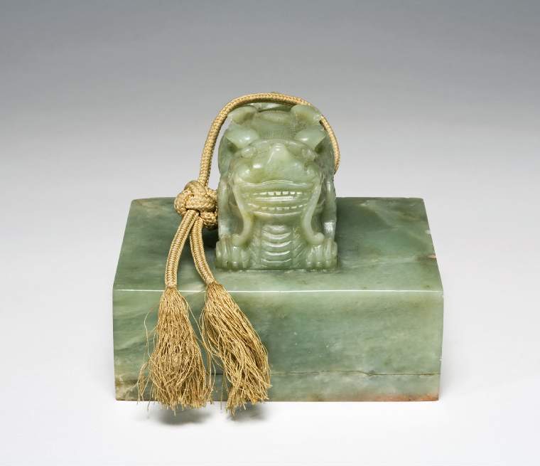细节:交龙钮的龙首雕刻细致,双目圆睁,龙角、龙须等细节清晰可辨;龙身的鳞片、肌肉线条等刻画入微,富有立体感;印台表面平整,底部刻有文字,字体规整,笔画线条流畅,工艺精湛;印章还系有一根带有流苏的绳索,绳索虽历经岁月,仍保存较好,与玉器相得益彰,增添了文物的完整性和历史感。