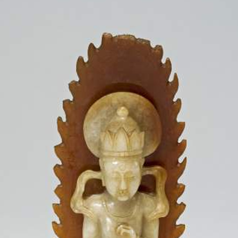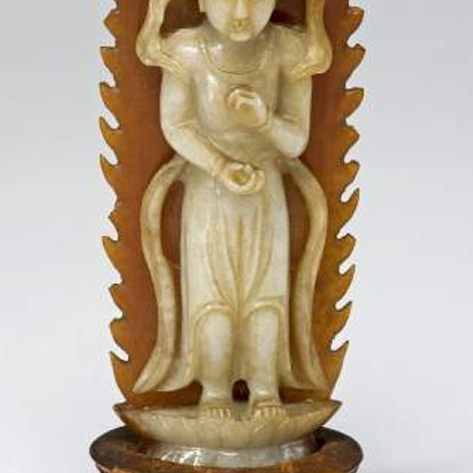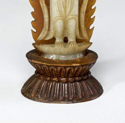 细节:宝冠雕刻精细,冠叶层次分明;面部丰腴饱满,双目微阖,嘴角含笑,神态慈悲安详;天衣与长裙的衣纹线条流畅自然,采用 “阴线刻” 与 “减地浮雕” 技法,生动表现出织物的垂坠感;莲花座花瓣饱满,背光火焰纹犀利规整,整体工艺精湛,体现了唐代玉雕的高超水平。