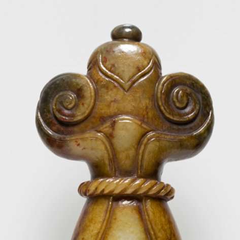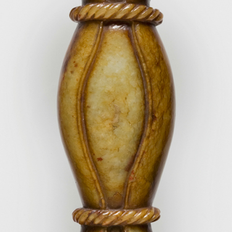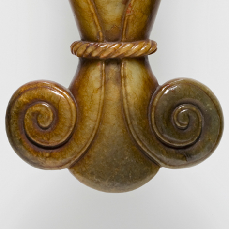 细节:上下卷云纹圆润流畅,涡旋线条转折自然,如流云婉转;中部两道缠绳纹写实逼真,“扭结” 细节清晰,模拟出绳索缠绕的真实质感;表面阴刻线条(划分卷云、瓶身轮廓)挺拔有力,与浮雕部分形成层次对比,尽显明代玉雕工匠对细节与质感的精妙把控。
