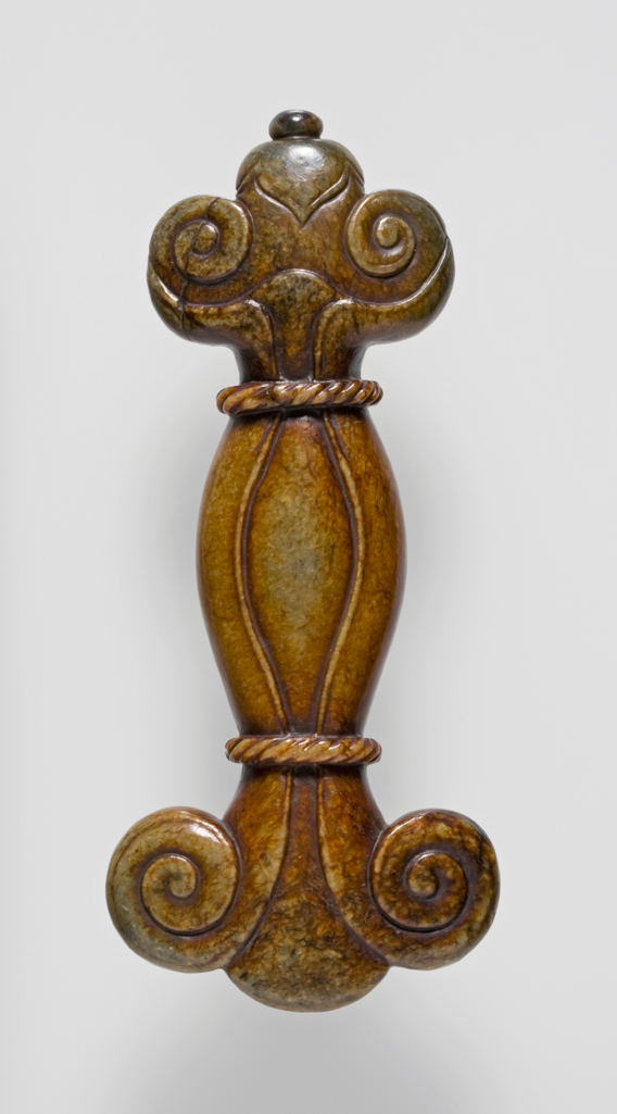 整体造型:呈纵向对称的长条形,上下两端雕琢对称卷云纹,中部为束腰椭圆瓶状轮廓,将 “卷云” 与 “瓶器” 意象融合,既规整庄重,又因卷云的灵动增添雅致感,推测为案头陈设器或具祈福寓意的摆件。